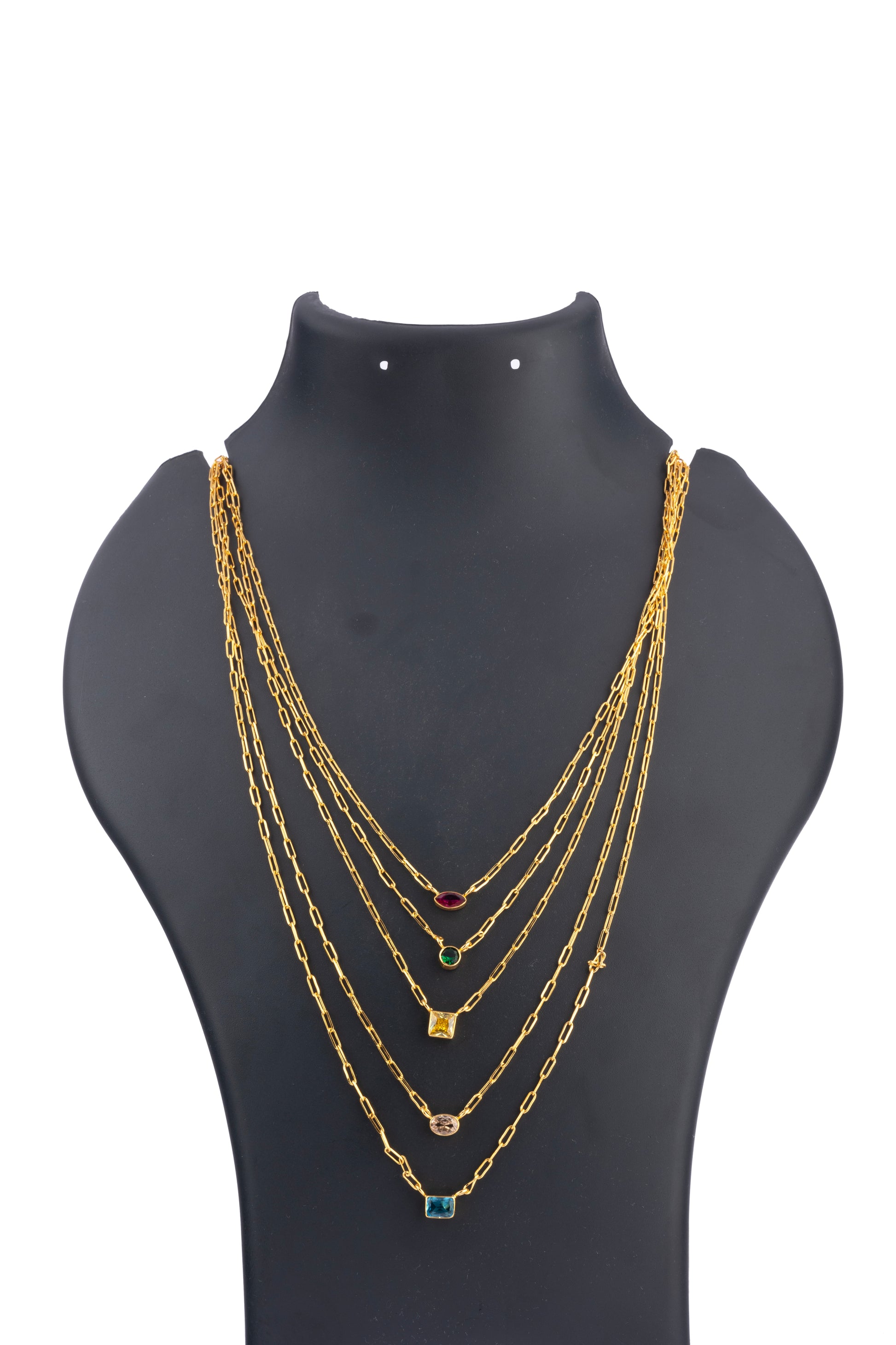 A vibrant symphony of color and sophistication, the Aurora Royale necklace is a bold expression of power, elegance, and confidence. Four layers of lustrous gold-finished chain links cascade gracefully, each crowned with a radiant emerald-cut gemstone in rich jewel tones: crimson garnet, regal amethyst, golden citrine, and sapphire blue.